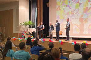 Ein Gruppenfoto von den Bigsteilnehmer*innen mit der Ausbildnerin. Zwei Personen halten Mikrofone und wirken wie bei einer Präsentation.