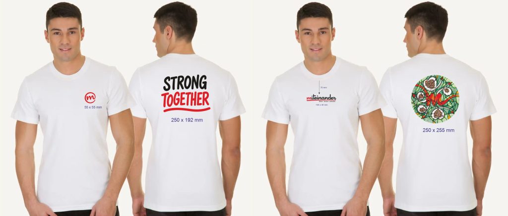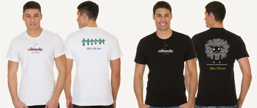 Die Shirts liegen in unserer Zentrale in Linz bereit – oder finden den Weg zu deinem Miteinander-Standort.